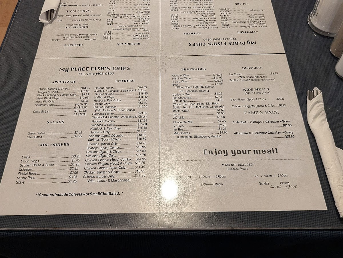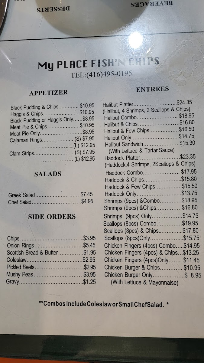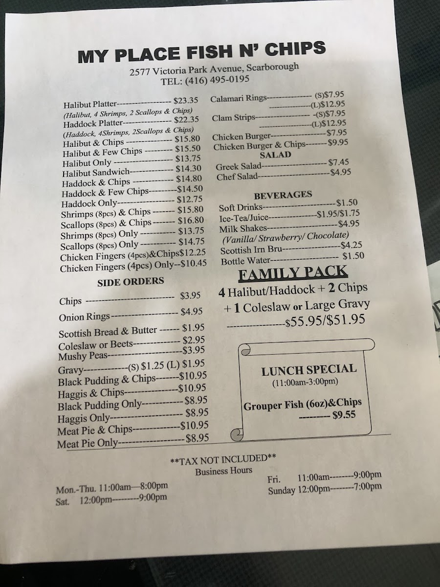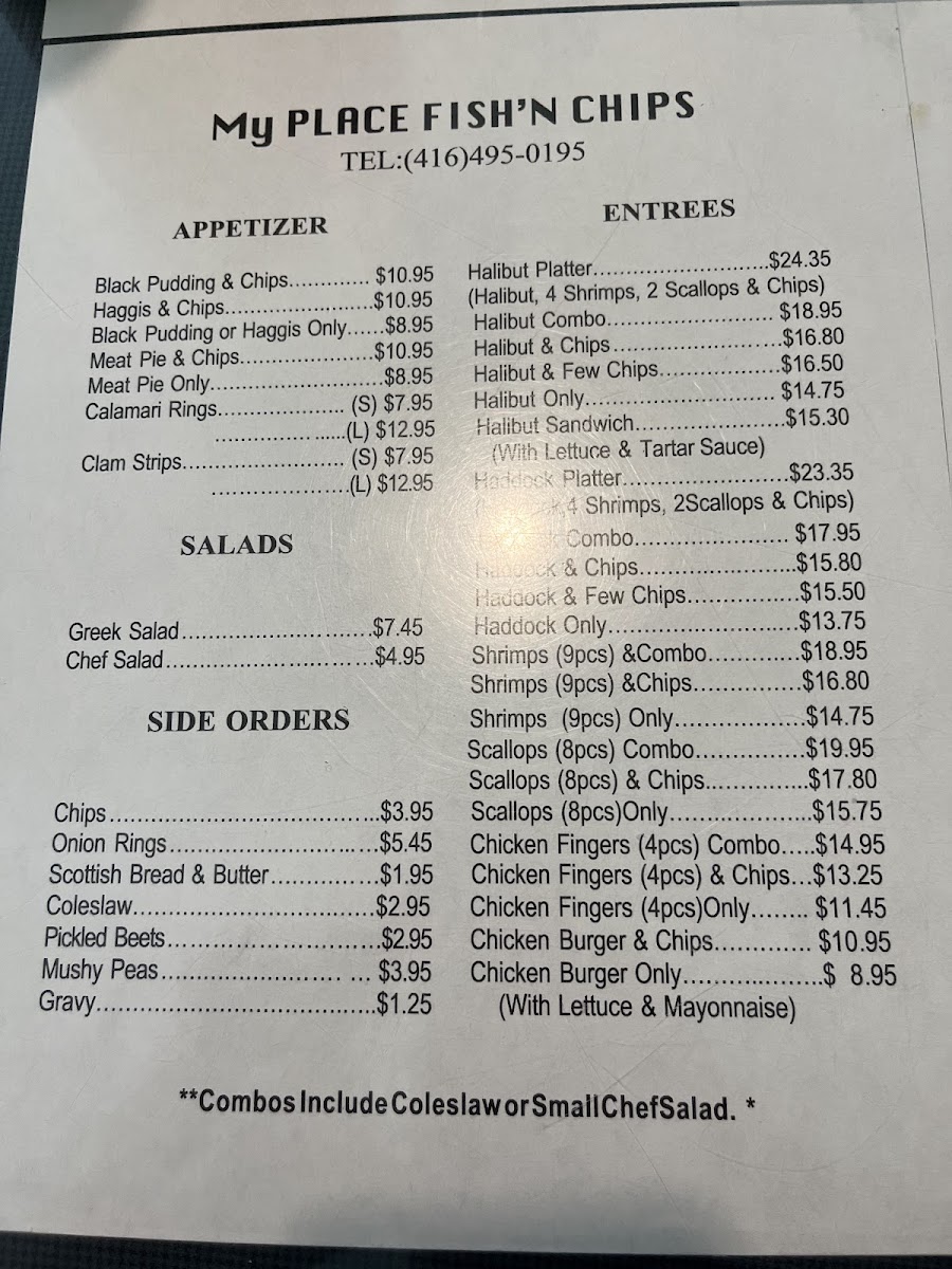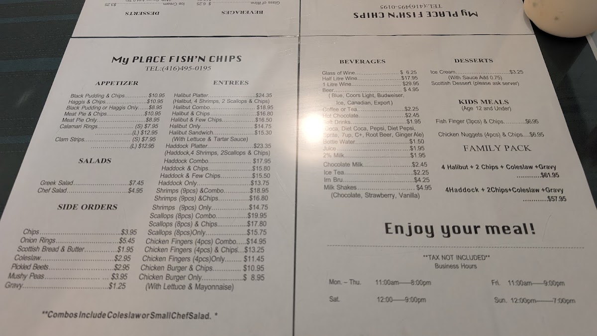 The menu at My Place Fish & Chips offers a variety of classic fish and chips options alongside complementary sides, salads, and beverages. It is structured to serve customers looking for quick, casual dining with meals available throughout the day, including lunch specials and family-sized portions.