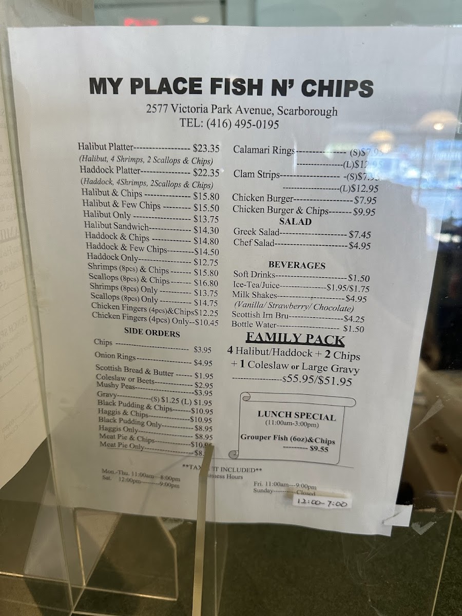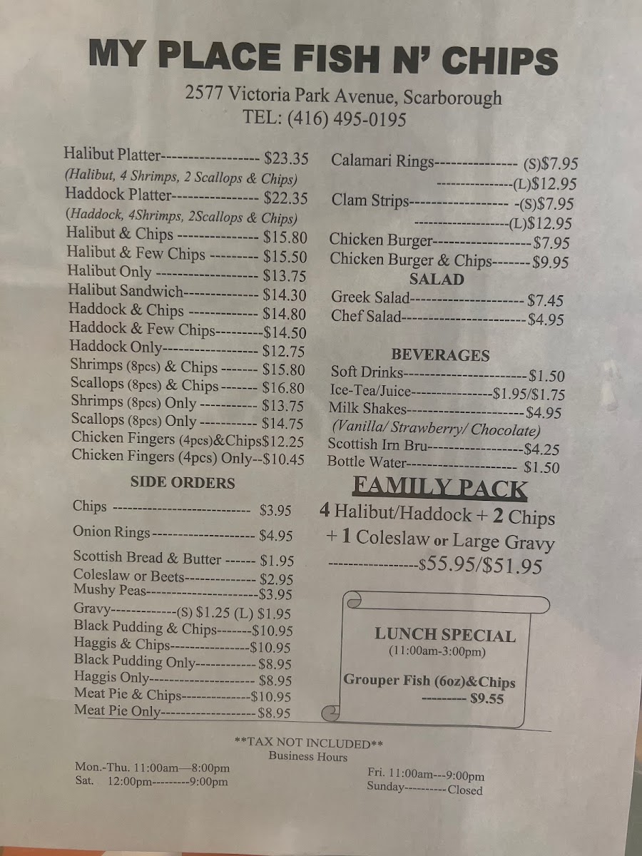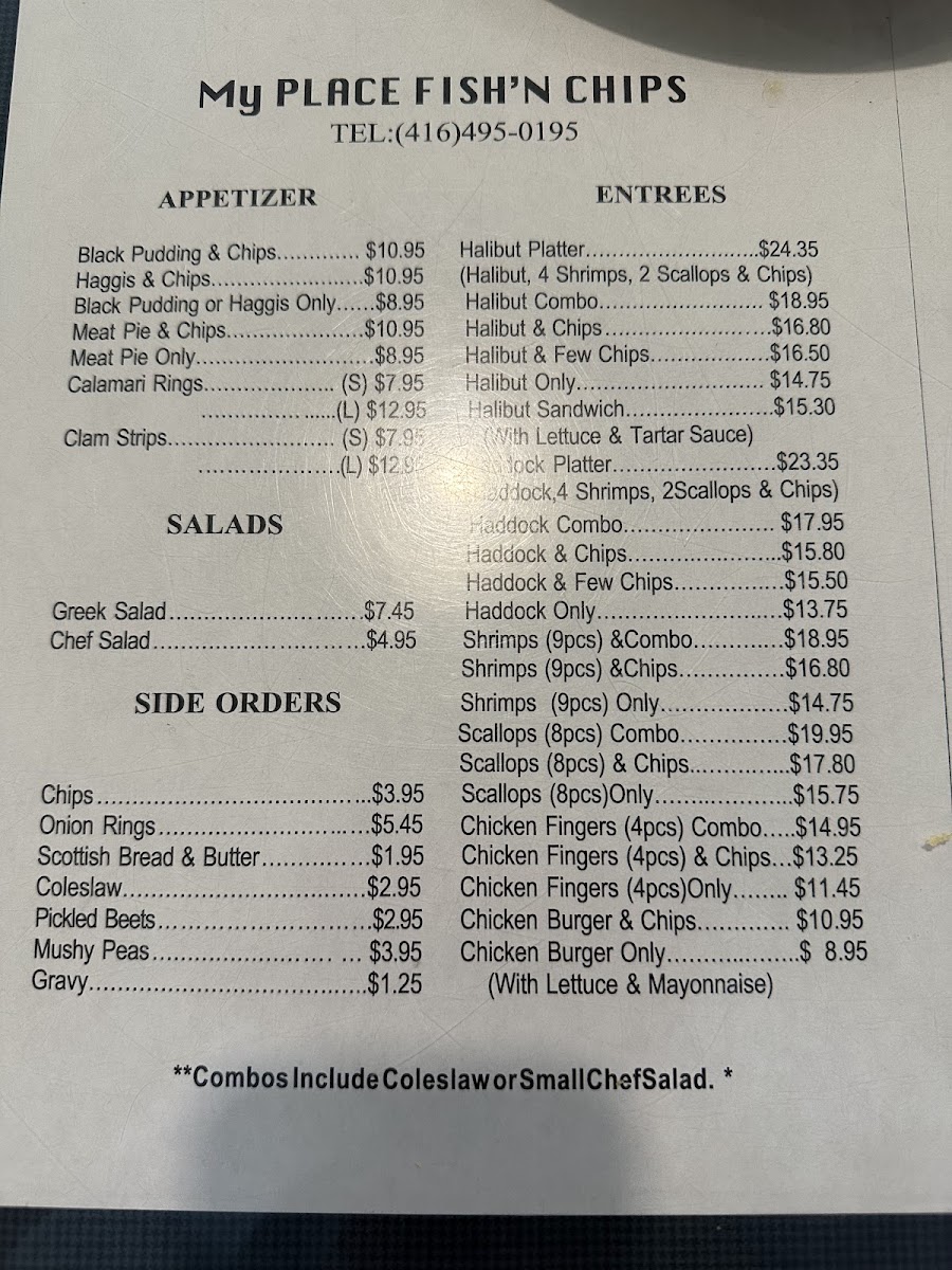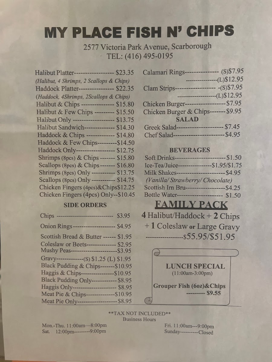 The menu at My Place Fish & Chips offers a variety of classic fish and chips options alongside complementary sides, salads, and beverages. It is structured to serve customers looking for quick, casual dining with meals available throughout the day, including lunch specials and family-sized portions.