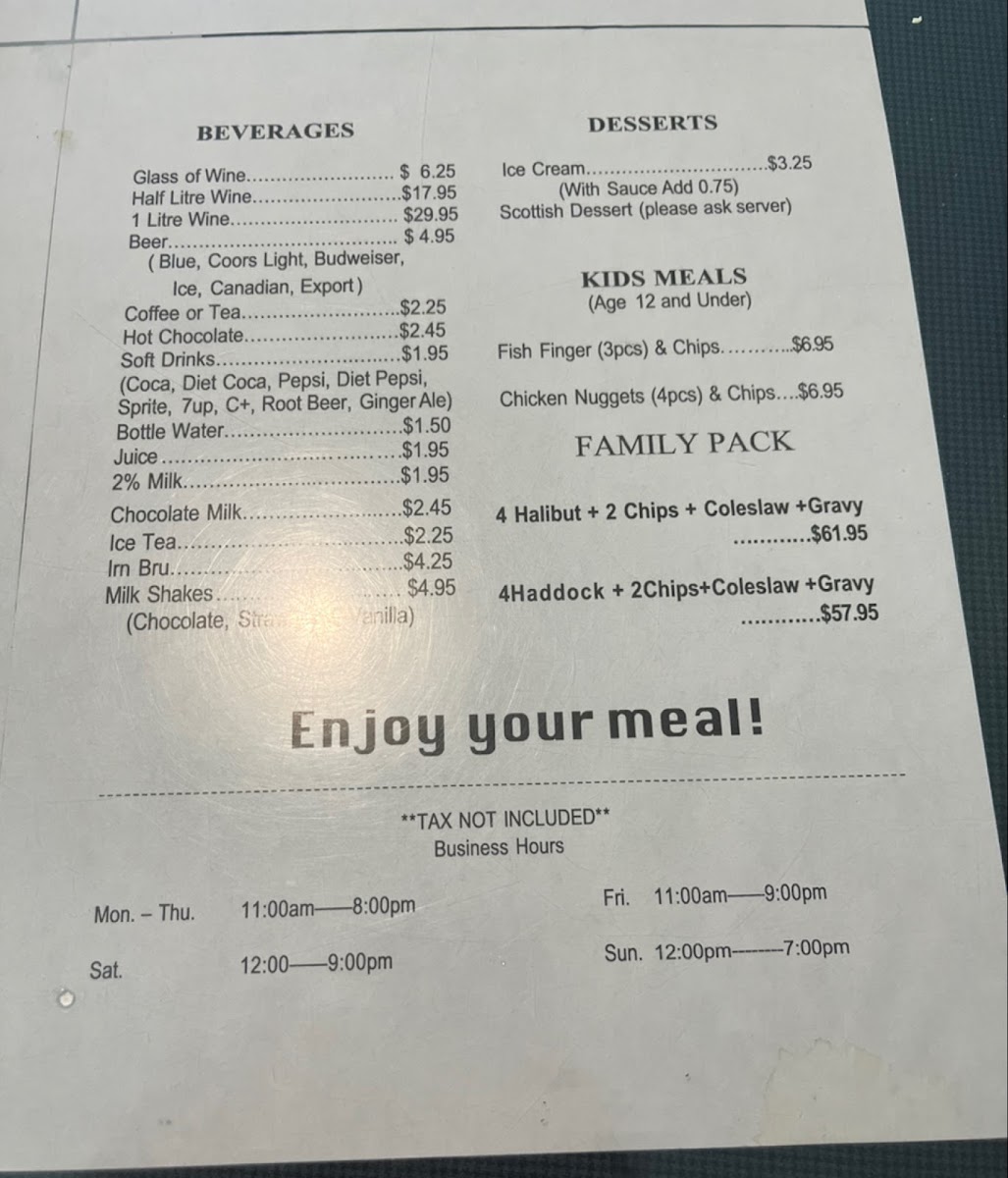 This menu is suited for lunch or casual meal occasions, with options for single servings or group dining. The combination of traditional fish and chip offerings with sides and beverages caters to a range of preferences within a fast food format.
